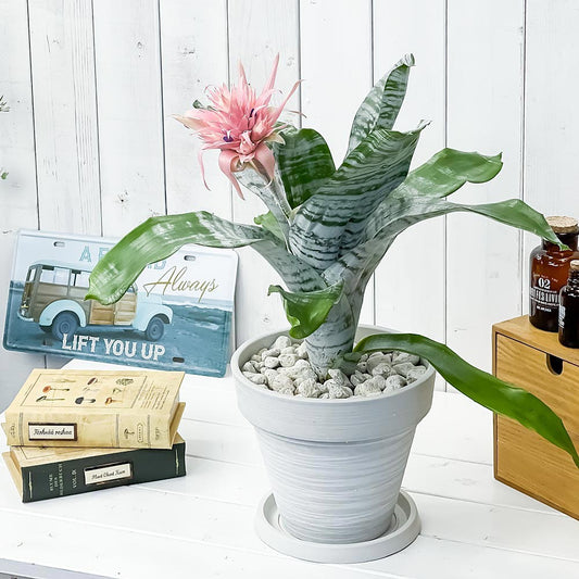 PLANCHU 観葉植物 エクメア ファシアータ 7号樹脂鉢 カーヴホワイト 受け皿付き 育て方説明書付き Aechmea fasciata シマサンゴアナナス ファシャータ ブロメリア