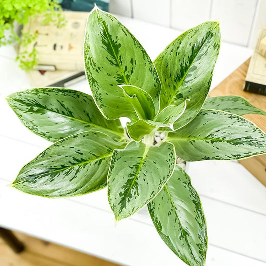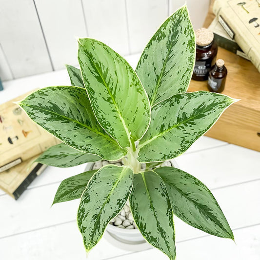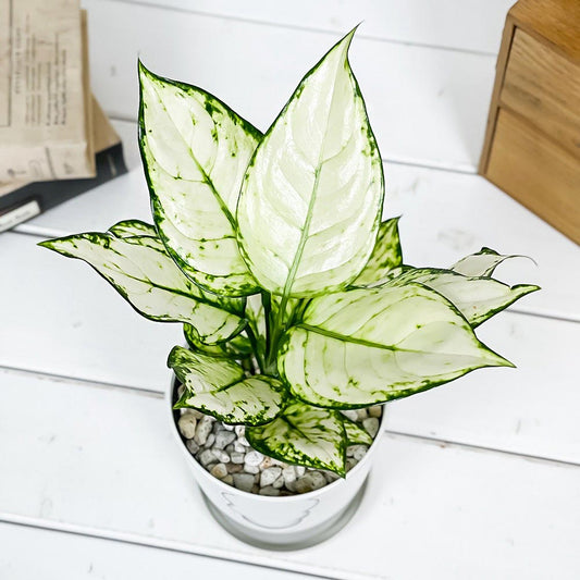 PLANCHU 観葉植物 アグラオネマ ホワイトバレンタイン 4号鉢 受け皿付き 育て方説明書付き Aglaonema ‘White Valentine’ 幸せを招くタイの宝石 アロイド