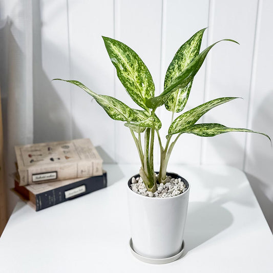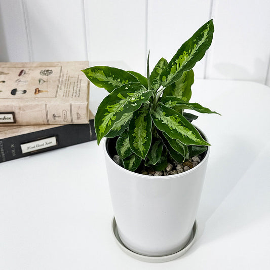 PLANCHU 観葉植物 アグラオネマ ホワイトライン 6号樹脂鉢 カーヴホワイト 受け皿付き 育て方説明書付き Aglaonema cv. 幸せを招くタイの宝石 アロイド