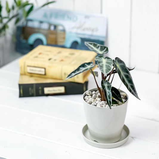 PLANCHU 観葉植物 アロカシア ナイロビナイツ 4号樹脂鉢 ダークグレー サスティー付き 受け皿付き 育て方説明書付き Alocasia ‘Nairobi Nights’ アロイド