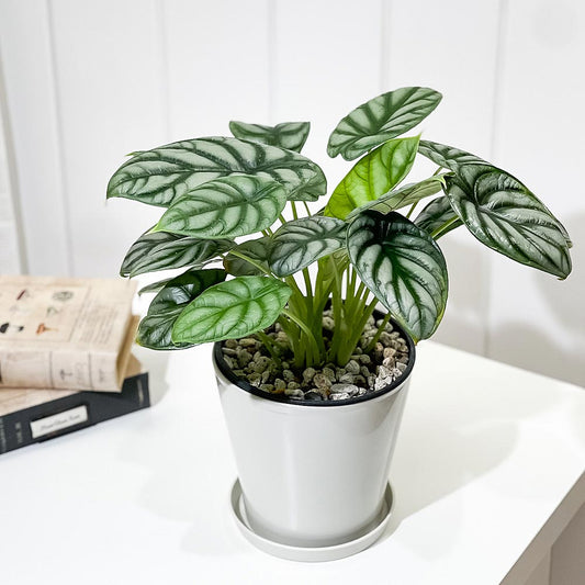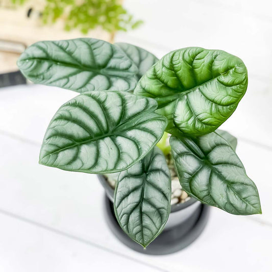PLANCHU 観葉植物 アロカシア シルバードラゴン 4号樹脂鉢 ダークグレー サスティー付き 受け皿付き 育て方説明書付き Alocasia ‘Silver Dragon’ アロイド