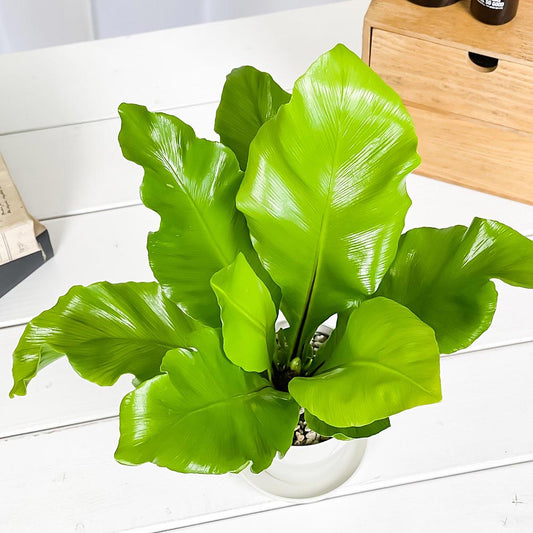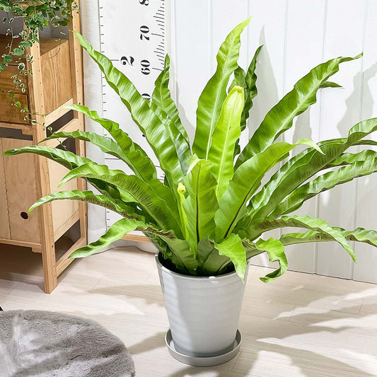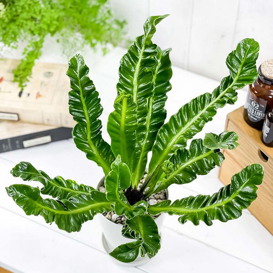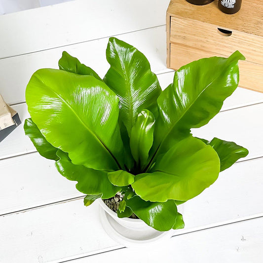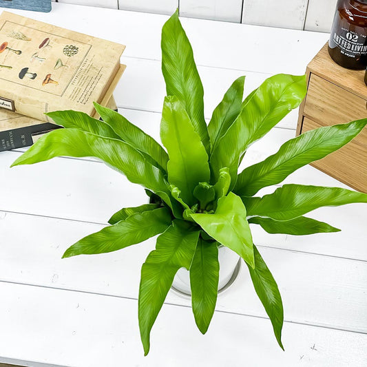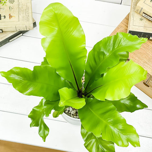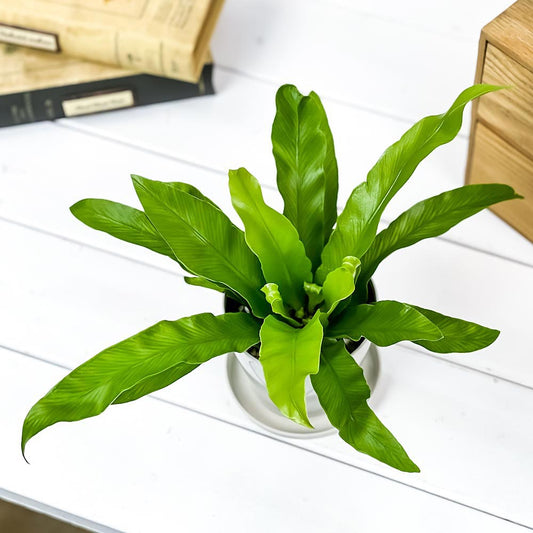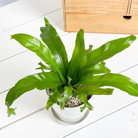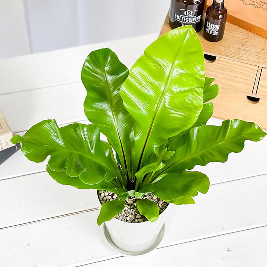 PLANCHU 観葉植物 アスプレニウム アビス 4号樹脂鉢 ホワイト サスティー付き 受け皿付き 育て方説明書付き Asplenium nidus ‘Avis’ シマオオタニワタリ シダ植物