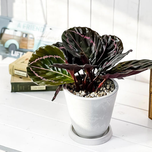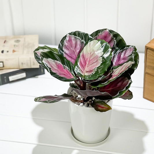 PLANCHU 観葉植物 カラテア ドッティ 5号樹脂鉢 ホワイト サスティー付き 受け皿付き 育て方説明書付き Calathea roseopicta ‘Dottie’