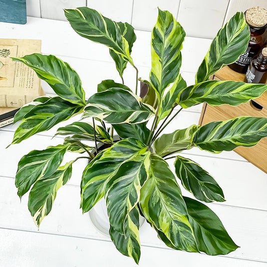 PLANCHU 観葉植物 カラテア ノーザンライト 4号鉢 受け皿付き 育て方説明書付き Calathea ‘Northern lights’