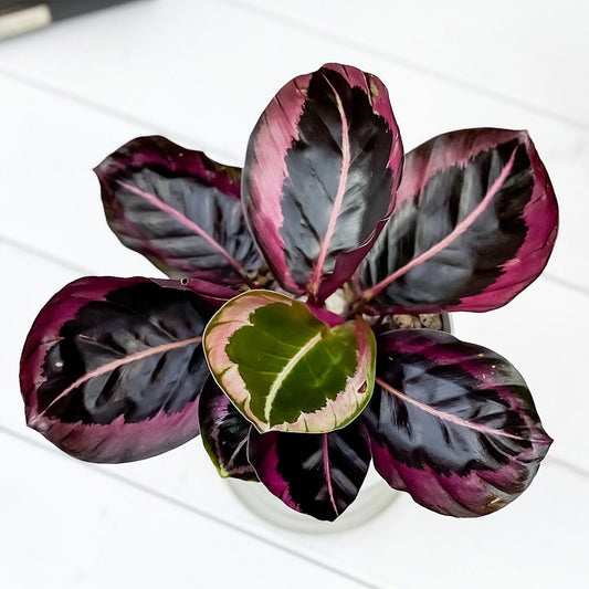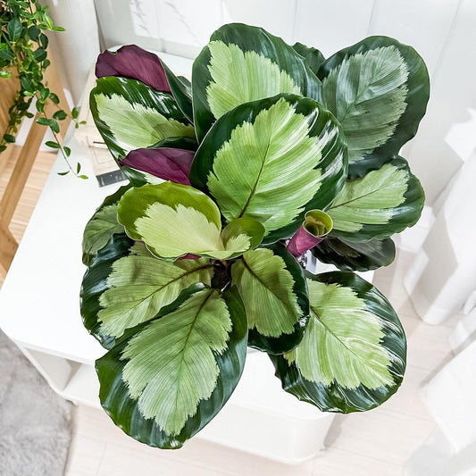 PLANCHU 観葉植物 カラテア パープルローズ 4号鉢 受け皿付き 育て方説明書付き Calathea ‘Purple Rose’