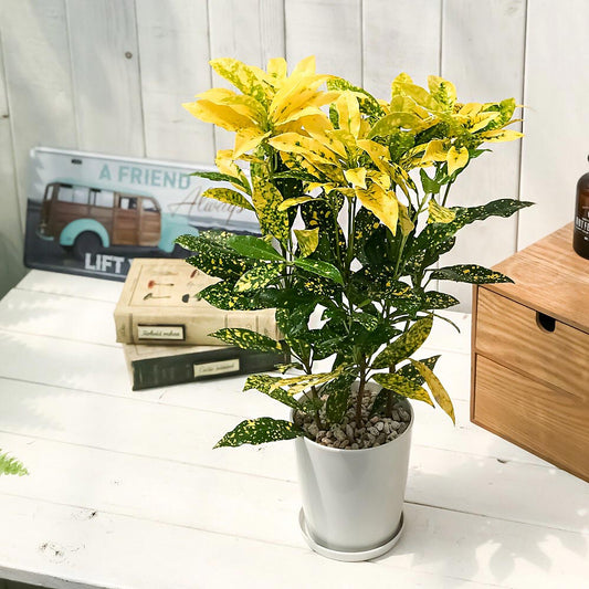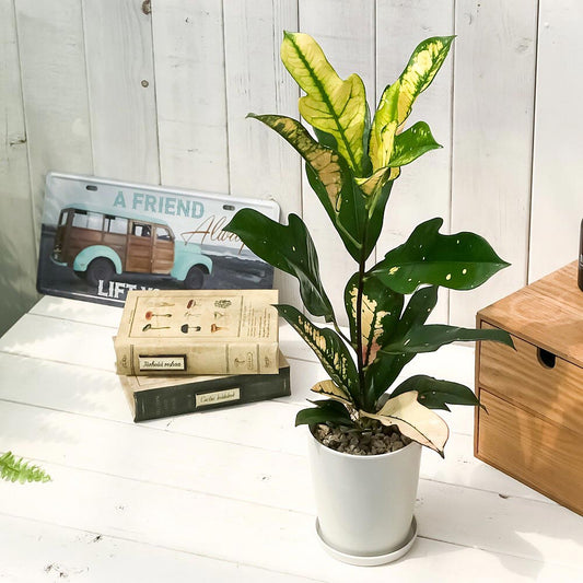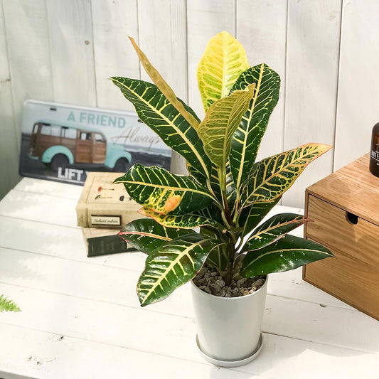 PLANCHU 観葉植物 クロトン 広葉系小型種 4号鉢 受け皿付き 育て方説明書付き Codiaeum variegatum cv. ヘンヨウボク 変葉木