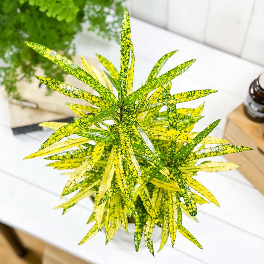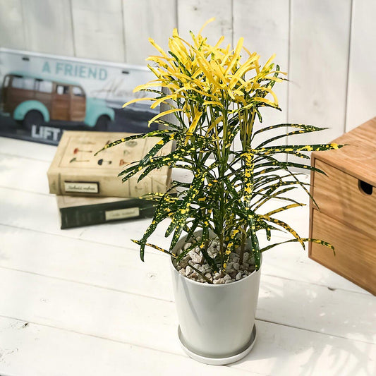 PLANCHU 観葉植物 クロトン 細葉系 4号鉢 受け皿付き 育て方説明書付き Codiaeum variegatum cv. ヘンヨウボク 変葉木 リュウセイ 流星
