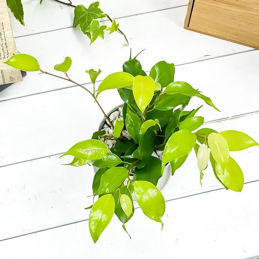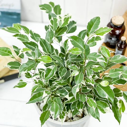 PLANCHU 観葉植物 フィカス ベンジャミン スターライト 4号鉢 受け皿付き 育て方説明書付き Ficus benjamina ‘Star Light’ 幸運を呼ぶ木 ゴムノキ ゴムの木