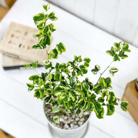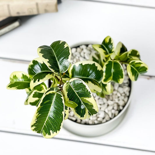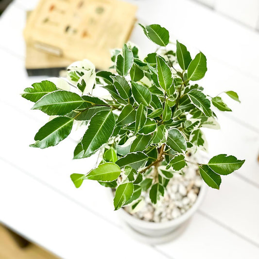 PLANCHU 観葉植物 フィカス ベンジャミン スターライト 3.5号鉢 受け皿付き 育て方説明書付き Ficus benjamina ‘Star Light’ 幸運を呼ぶ木 ゴムノキ ゴムの木