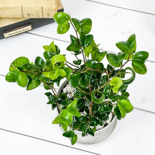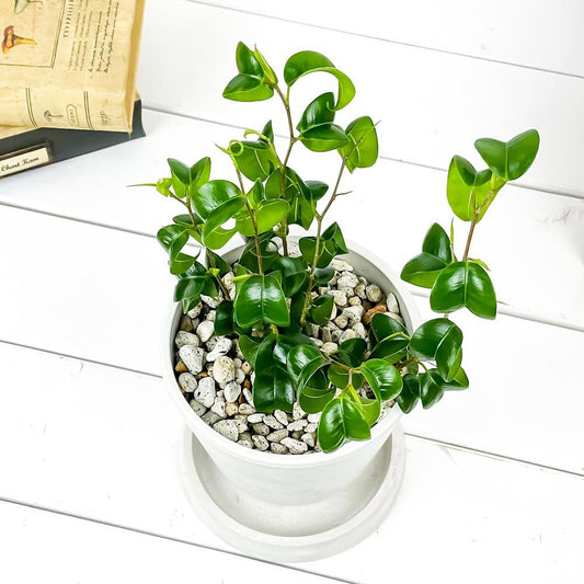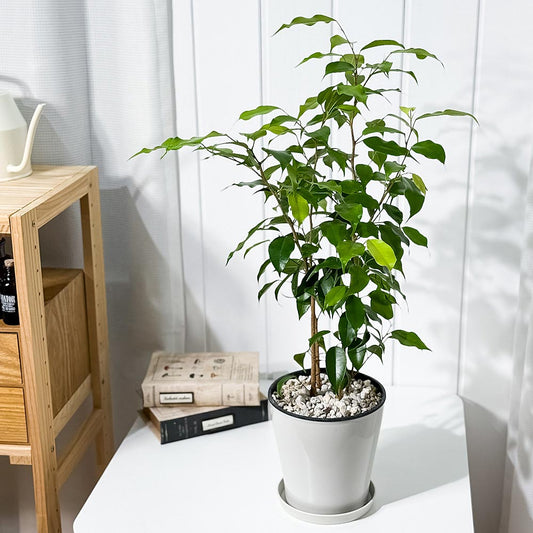 PLANCHU 観葉植物 フィカス ベンジャミン バロック 4号樹脂鉢 ホワイト サスティー付き 受け皿付き 育て方説明書付き PVP Ficus benjamina ‘Barok’ 幸運を呼ぶ木