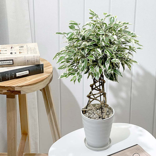 PLANCHU 観葉植物 フィカス ベンジャミン スターライト 編み込み 4号鉢 受け皿付き 育て方説明書付き Ficus benjamina ‘Star Light’ 幸運を呼ぶ木 ゴムノキ ゴムの木