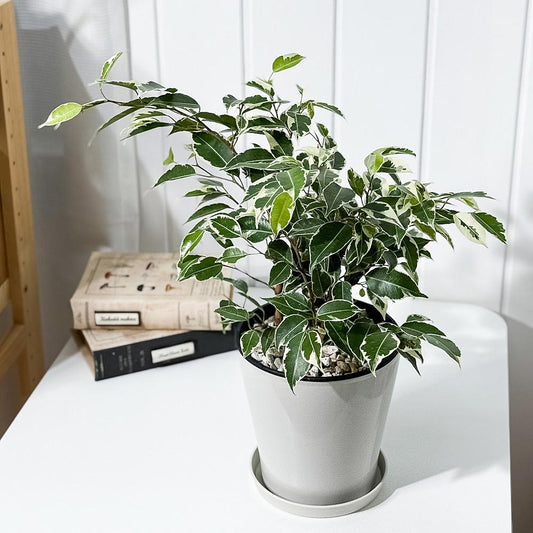 PLANCHU 観葉植物 フィカス ベンジャミン スターライト 7号樹脂鉢 カーヴホワイト 受け皿付き 育て方説明書付き Ficus benjamina ‘Star Light’ 幸運を呼ぶ木