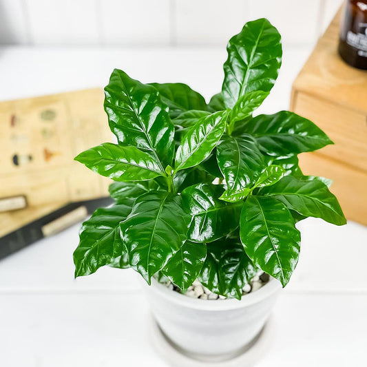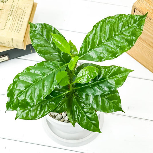 PLANCHU 観葉植物 コーヒーノキ アラビカ 4号樹脂鉢 ホワイト サスティー付き 受け皿付き 育て方説明書付き Coffea arabica コーヒーの木 珈琲の木 アラビカコーヒー