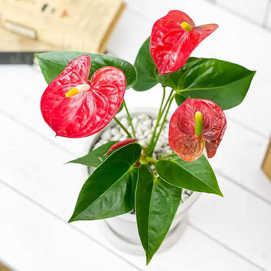 PLANCHU 観葉植物 アンスリウム レッド 5号樹脂鉢 ホワイト サスティー付き 受け皿付き 育て方説明書付き Anthurium andraeanum cv. アンスリューム アロイド 鉢花