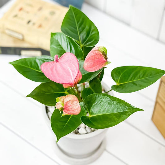 PLANCHU 観葉植物 アンスリウム ピンク 5号樹脂鉢 ホワイト サスティー付き 受け皿付き 育て方説明書付き Anthurium andraeanum cv. アンスリューム アロイド 鉢花