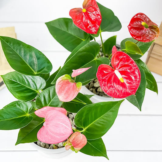 PLANCHU 観葉植物 アンスリウム レッド & ピンク 2鉢セット 5号樹脂鉢 ホワイト サスティー付き 受け皿付き 育て方説明書付き アンスリューム 鉢花