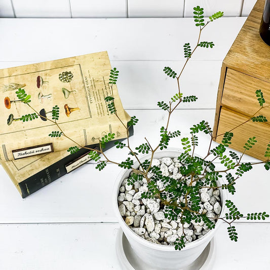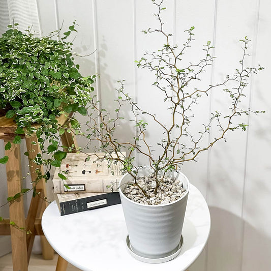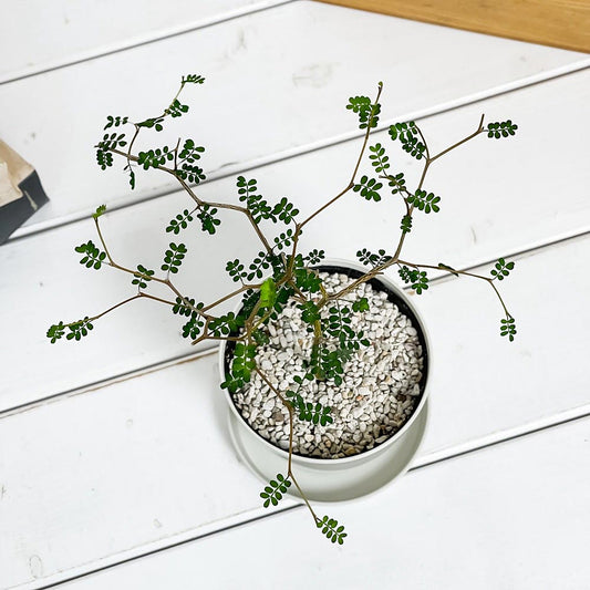 PLANCHU 観葉植物 メルヘンの木 ソフォラ リトルベイビー 4号樹脂鉢 ホワイト サスティー付き 受け皿付き 育て方説明書付き Sophora prostrata ‘Little Baby’